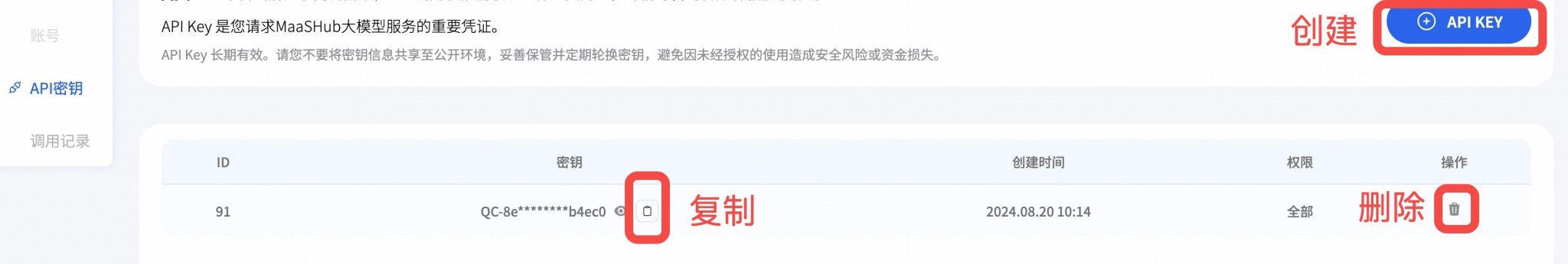 请妥善保管密钥,避免泄露。您可以随时删除它。