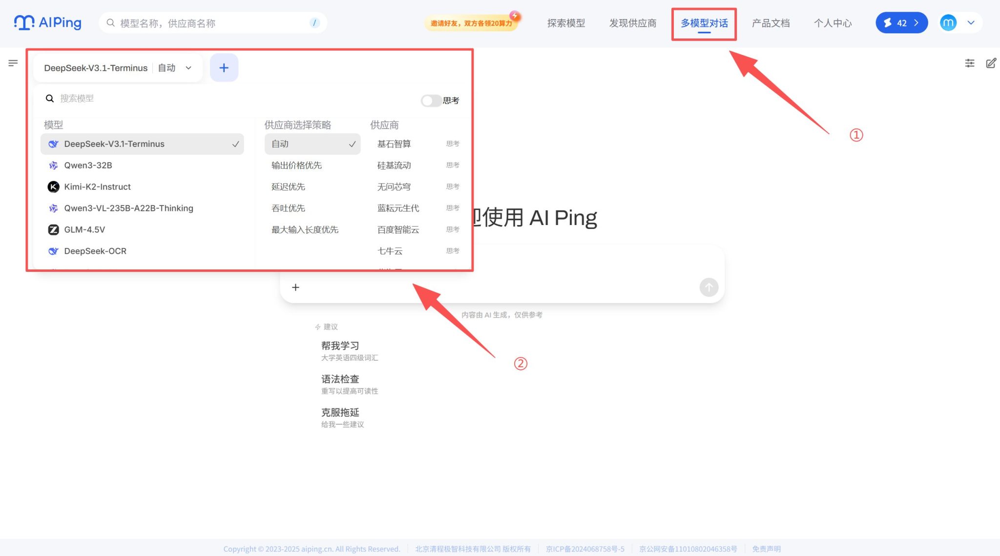 进入首页的“多模型对话”的页面,接着一键切换不同的AI模型,就能在各种使用场景都进行对比测试