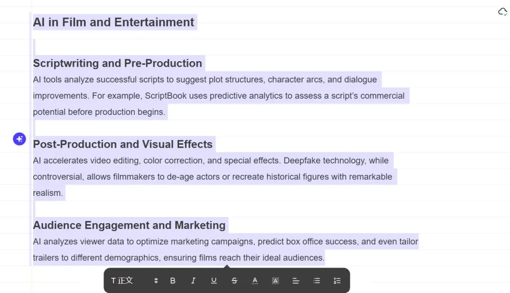- AI帮写文本:用户可自行输入或复制粘贴文本,但若希望节省时间,也可向AI提供主题,让其自动生成文本。这个功能在开展头脑风暴活动,或是需要迅速搭建内容框架的时候,显得格外实用。