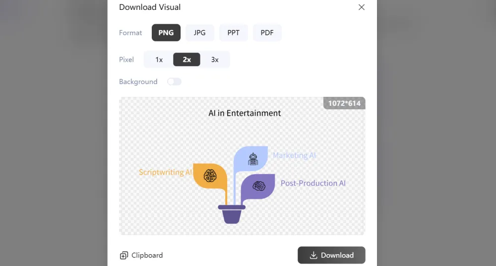 - 输出与分享:完成的图表可下载为PNG、JPG、PDF、PPT格式,无缝插入各种办公工具及自媒体投稿。此外,还可将其以PNG或PDF的形式直接单独输出,通过一键链接与他人分享,更好地将您的精彩创意与方案与他人共享。