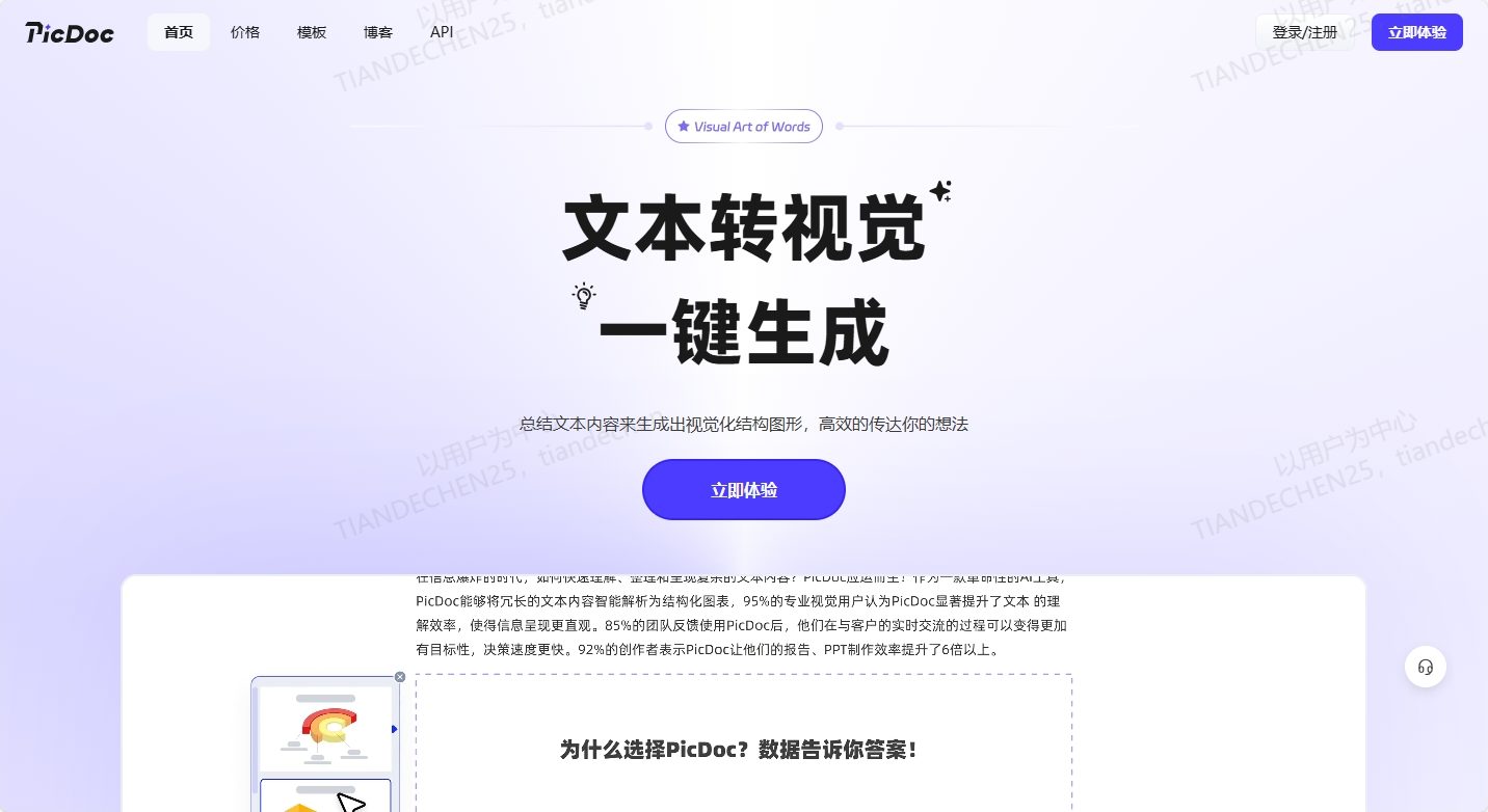 PicDoc是一款依托AI技术打造的文本转视觉内容生成器,它能把输入的文字内容自动转化成图表、流程图,还有信息图之类的视觉元素图像,通过以最具创意的可视化的方式将用户知识、想法和精彩的商业故事都展现出来。