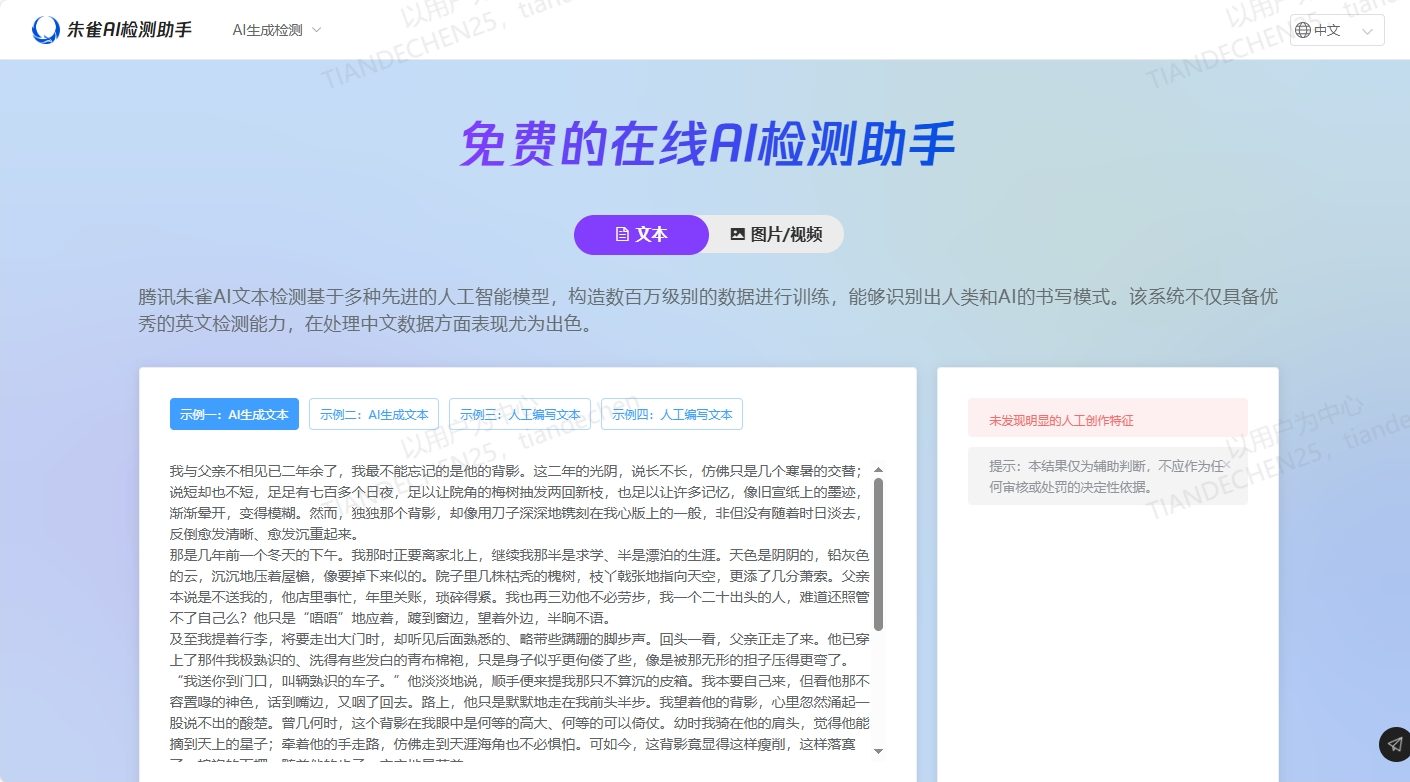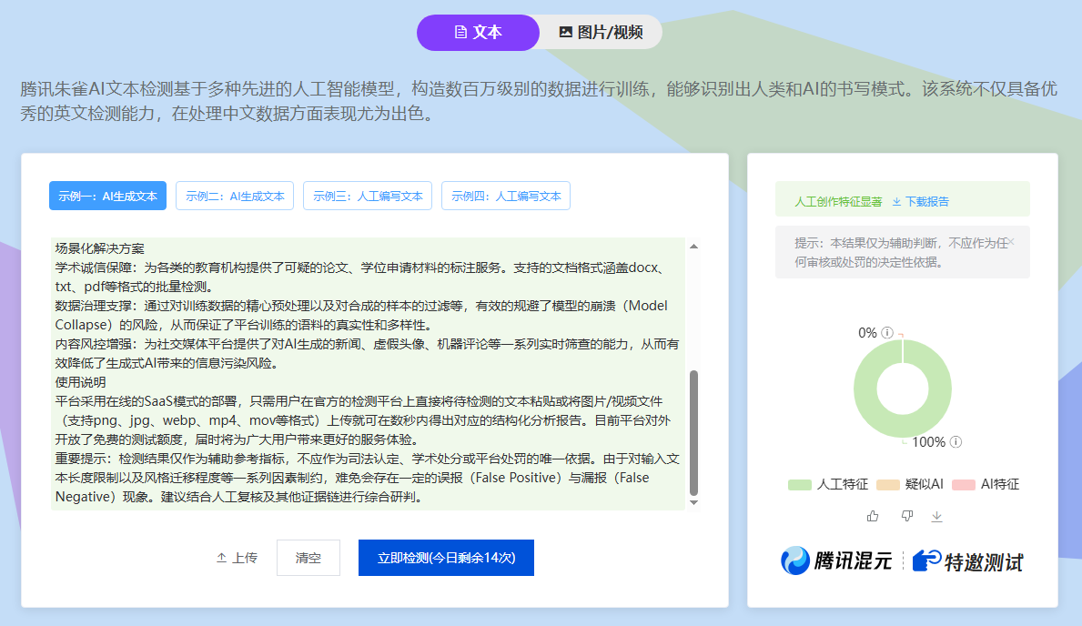 - 凭借对数千万级的学术论文、创意写作、新闻报道、各类的编程代码等文本载体的深度融合,以及对摄影、数字艺术、影视素材等视觉内容的深入挖掘,朱雀AI检测平台逐步的完善了对生成式内容的甄别能力。通过持续迭代机制,每月更新检测模型以适配最新一代生成模型的演进。